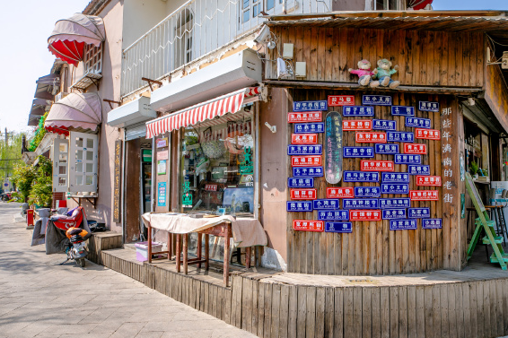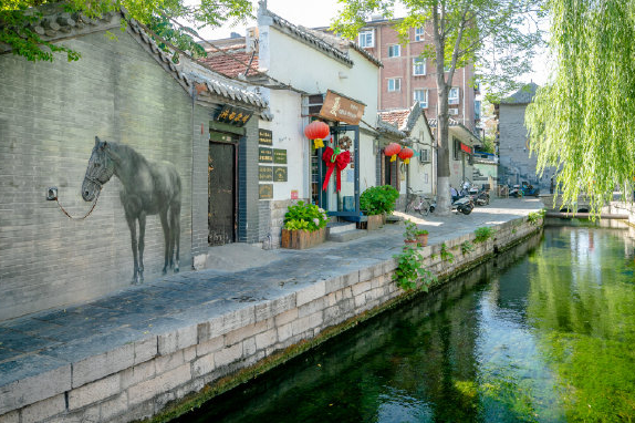 街道一邊是青磚紅瓦的老式建筑,一邊是清澈見底的泉水,街上隨處可見文藝小館、商鋪和人家,白墻灰瓦的民居中不時(shí)傳來地道的濟(jì)南話,讓人仿佛走入了江南的小橋流水人家。