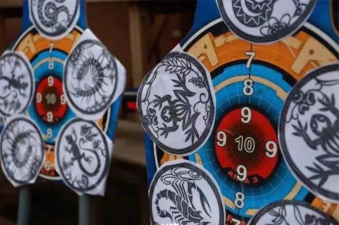 實(shí)彈射擊,參與者打中靶紙上任意一個(gè)“五毒”即可獲贈(zèng)精美子彈工藝品1個(gè);弓箭射箭,由教官帶領(lǐng)孩子進(jìn)行弓箭射五毒活動(dòng)并講授五毒文化與端午節(jié)文化由來。
