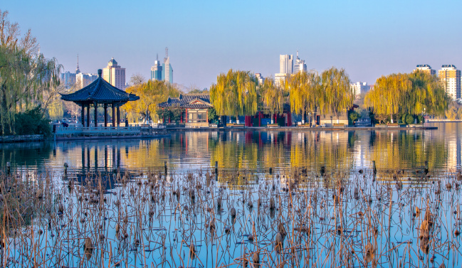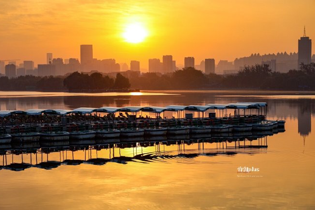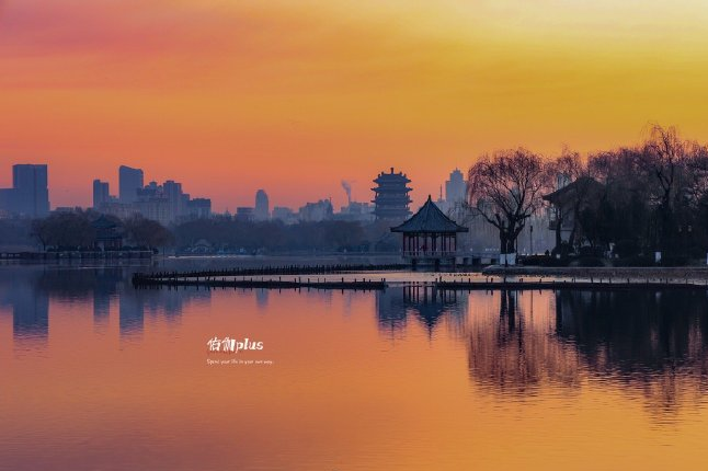 冬日的太陽是最讓人歡喜的,清晨日出前后是大明湖最美的時刻,朝霞漫撒在湖面上,把湖面染成金黃色,水天一色美如畫卷,給冬日的泉城濟南增添一份活力。
