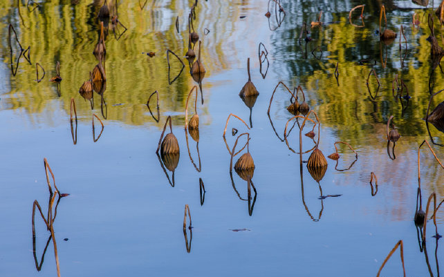 荷桿有的筆直,有的彎曲,或折成幾段,與水中的倒影組成幾何圖案,變化萬千。雖然芬芳吐盡,卻帶有韻味。在陽光的映照下,呈現(xiàn)出耀耀生輝的金黃色澤。