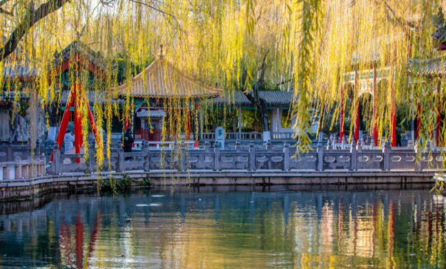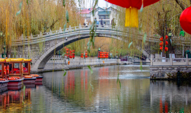 而漫步在護城河畔,聽潺潺泉水作響,琵琶泉泉聲淙淙如琵琶揚韻、五蓮泉水泡成簇盛于水面、白石泉點點白石潺潺碧水、瑪瑙泉如寶石般光彩奪目……觀賞畫舫穿梭于水面之上,如畫兒一般的景象美得讓人沉醉其中。