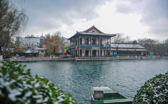 冬天的大明湖,有著獨特的園林景觀。在夏天碧葉接天、紅花映日的荷花,到了數(shù)九寒天之際仍體現(xiàn)出不同的園林之美。