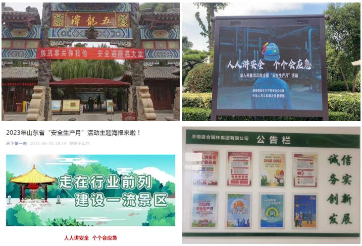 3. 開展廣泛宣傳。各單位結(jié)合實際,多形式、多角度進行宣傳。第一泉景區(qū)利用微信公眾號轉(zhuǎn)發(fā)山東省“安全生產(chǎn)月”宣傳海報,在趵突泉、五龍?zhí)?、大明湖等人流密集區(qū)域懸掛宣傳橫幅22條。旅開公司、濟南野生動物世界、產(chǎn)業(yè)運營公司等利用大屏幕持續(xù)滾動播放安全知識和宣傳標(biāo)語,通過懸掛條幅、制作宣傳海報等方式對安全生產(chǎn)月活動進行大力宣傳。同時,百合園林、萊蕪城投在辦公區(qū)域宣傳欄、樓道等醒目位置張貼“安全生產(chǎn)月”活動主題標(biāo)語或宣傳畫,營造全員關(guān)心安全生產(chǎn)、參與安全發(fā)展的濃厚輿論氛圍。
