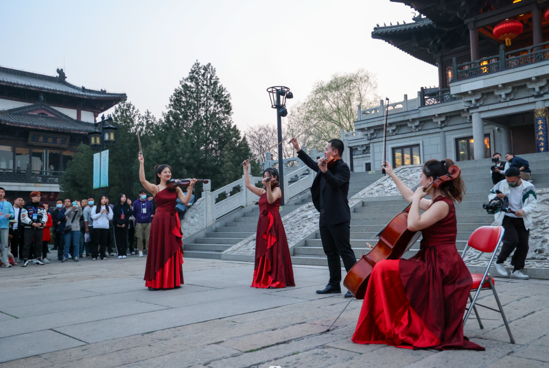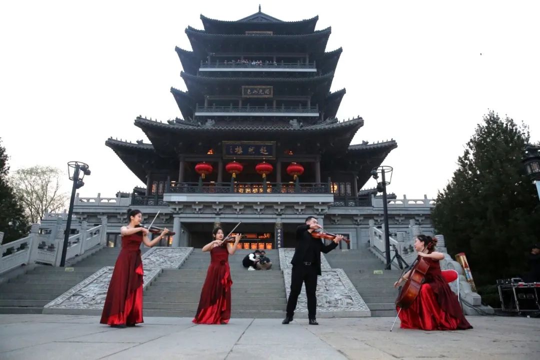 驚蟄節(jié)氣的傍晚,晚霞將天空暈染成一片金黃,余暉給泉城披上了盛裝,把明湖碧波輝映成金色鱗狀,人們紛紛拿起相機捕捉這盛世美好,靜候著那激動人心的“燃燈時刻”。時間在滴答滴答行進著,突然,一隊著華服女子懷抱提琴魚貫而入,超然樓階前坐定后,一曲弦樂四重奏旋即響徹大明湖畔,迅速引起現(xiàn)場一陣陣驚呼……原來,“文藝點亮泉城”超然樓二十四節(jié)氣快閃驚蟄首場活動在此華彩啟幕。