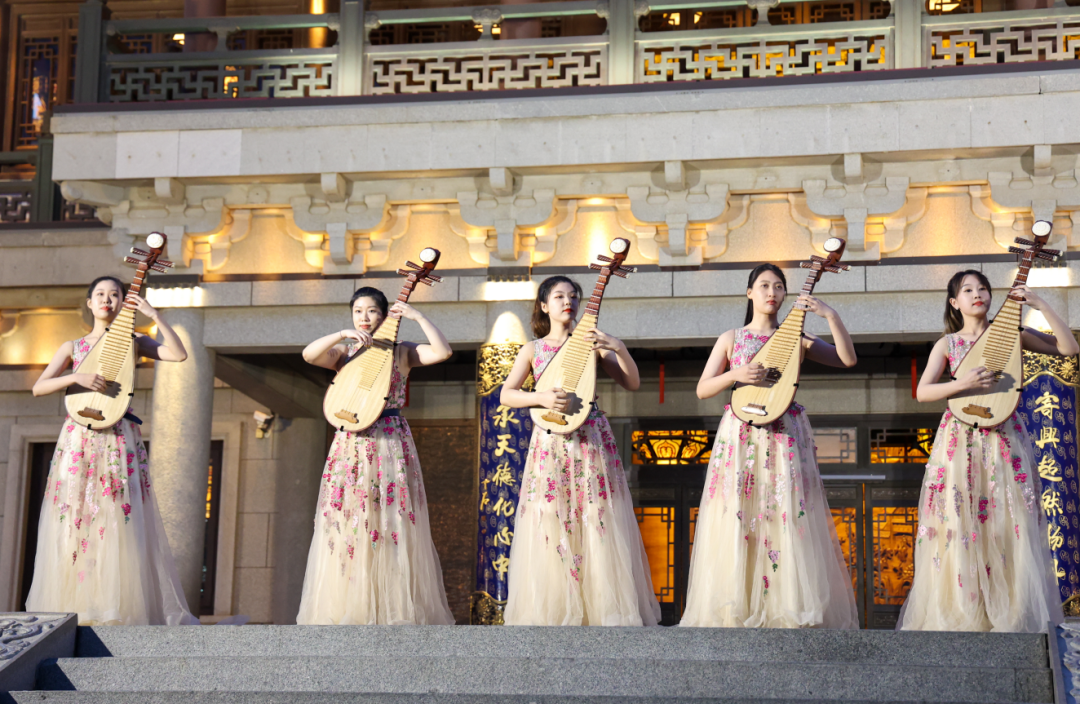 而就在此時,超然樓中十位漢服仙子翩然而出,翩若驚鴻、婉若游龍,她們懷抱琵琶、中阮,委婉古樸的旋律隨即緩緩流淌開去,這便是彈撥樂重奏《春江花月夜》。樂曲通過流暢多變的節(jié)奏,巧妙細膩的配器,絲絲入扣的演奏,仿佛令人發(fā)生了情境穿越,恰似形象描繪了月夜明湖的迷人景色,盡情贊頌泉城人家的風姿異態(tài),此情此景則更印證了那句“濟南瀟灑似江南”。一曲奏畢,現(xiàn)場再次人聲鼎沸,不少游客都將這一絕美過程記錄下來,口中嘖嘖稱贊,“羨煞濟南山水好”,“有心常作濟南人”。