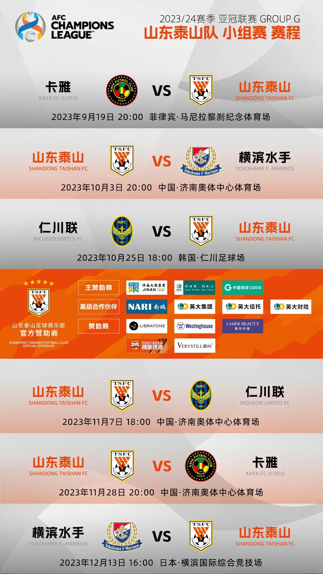 2023/24亞冠聯(lián)賽小組賽山東泰山隊賽程出爐