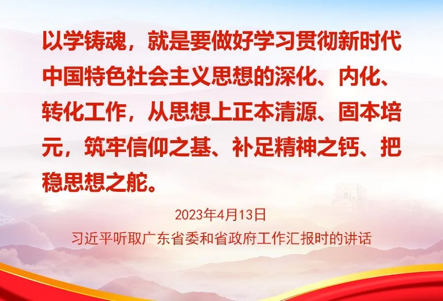2023年4月,習(xí)近平總書記在廣東考察時指出,開展主題教育是今年黨的建設(shè)的重大任務(wù)。各級黨組織要堅決貫徹落實黨中央的工作部署,教育引導(dǎo)黨員、干部在以學(xué)鑄魂、以學(xué)增智、以學(xué)正風(fēng)、以學(xué)促干上下功夫見實效。
