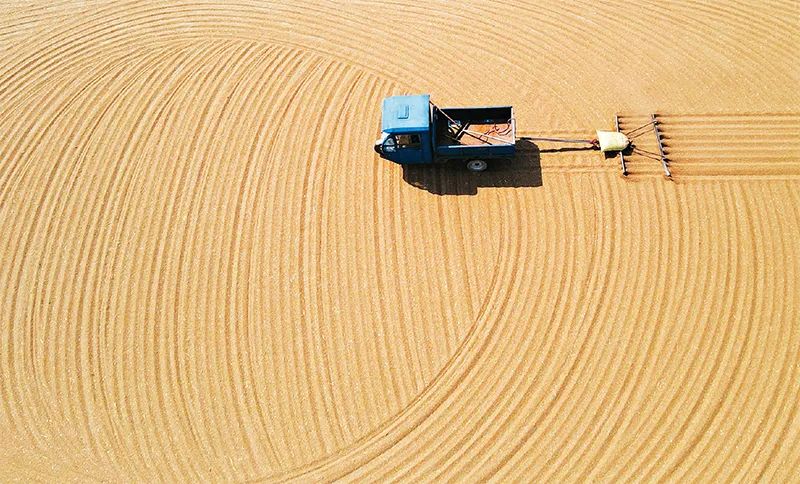 6月,正值小麥集中收獲時(shí)節(jié),各地農(nóng)民搶抓晴好天氣忙著收割、晾曬小麥,確保小麥顆粒歸倉(cāng)。圖為2023年6月9日,在江蘇省如皋市糧食儲(chǔ)備有限公司曬糧場(chǎng)上,工作人員用機(jī)械翻曬入庫(kù)的小麥。新華社發(fā) 吳樹建/攝