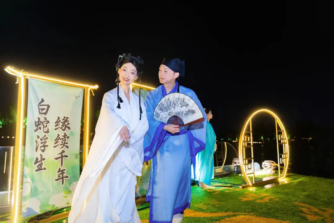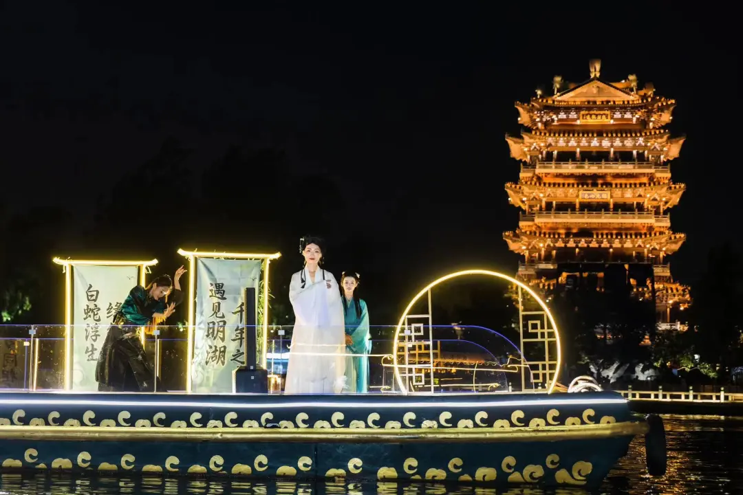 本次演出融合國(guó)漫電影《白蛇·浮生》元素,打造電影主題國(guó)風(fēng)船只,演員化身電影中的經(jīng)典角色白蛇、青蛇與許仙,配合電影經(jīng)典片尾曲《千年等一回》、主題曲《浮生一白》、定情曲《何須問》等優(yōu)美旋律,在七夕節(jié)當(dāng)晚現(xiàn)場(chǎng)演繹白娘子與許仙的愛情故事,將這段發(fā)生在西湖的美麗故事轉(zhuǎn)移至大明湖,續(xù)寫經(jīng)典愛情神話,營(yíng)造七夕浪漫氛圍,展現(xiàn)城市文化旅游深厚底蘊(yùn)。