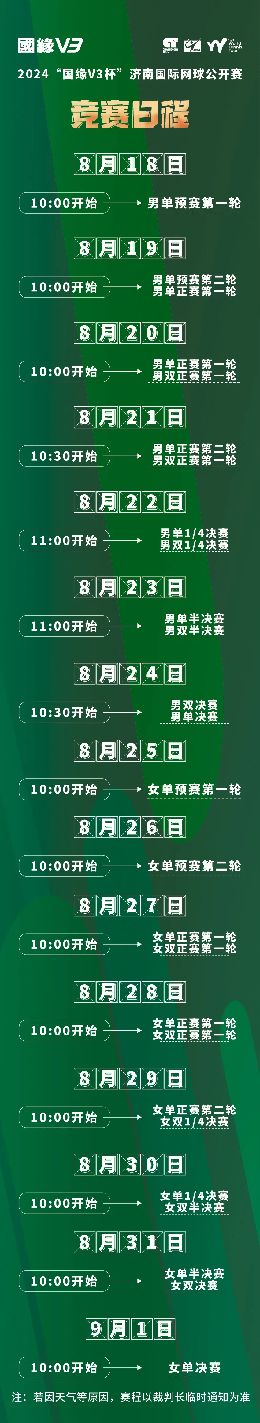 男單預(yù)賽將于8月18日至8月19日激烈展開,為正賽預(yù)熱;而男子的正賽則將于8月19日至8月24日展開激烈角逐,男雙和男單決賽定于8月24日上演。緊接著,女單選手們將在8月25日至8月26日進(jìn)行激烈的預(yù)賽角逐,為正賽的開啟預(yù)埋伏筆;女子正賽將在8月27日至9月1日精彩上演,女雙決賽定于8月31日舉行,而備受期待的女單決賽將在9月1日震撼登場(chǎng)。