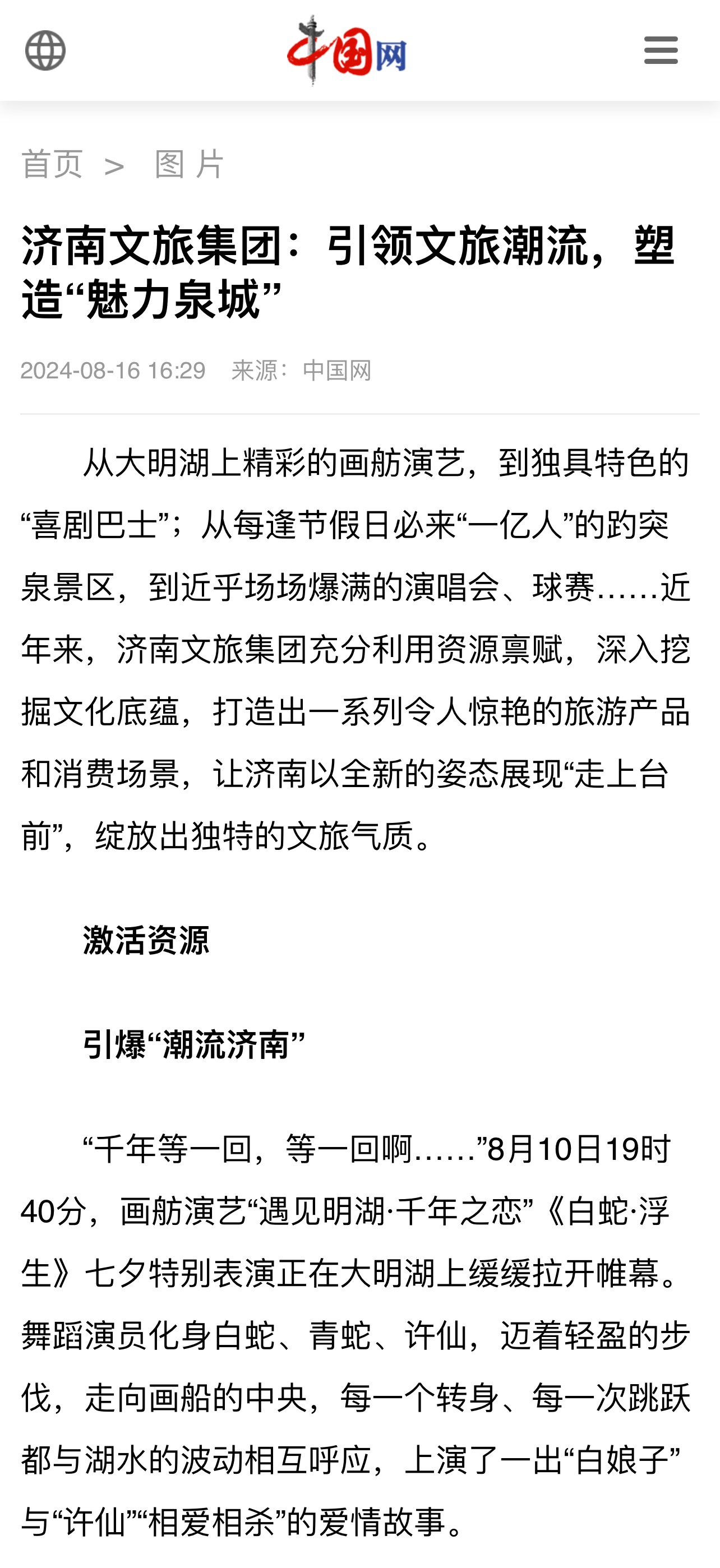 近日,《中國網(wǎng)》聚焦?jié)衔穆眉瘓F(tuán),以《濟(jì)南文旅集團(tuán):引領(lǐng)文旅潮流 塑造“魅力泉城”》為題,對集團(tuán)挖掘文化底蘊(yùn),打造出一系列旅游產(chǎn)品和消費(fèi)場景的經(jīng)驗(yàn)做法予以宣傳報(bào)道,人民日報(bào)社中國經(jīng)濟(jì)周刊官網(wǎng)等媒體紛紛轉(zhuǎn)載。文章寫到:近年來,濟(jì)南文旅集團(tuán)充分利用資源稟賦,深入挖掘文化底蘊(yùn),打造出一系列令人驚艷的旅游產(chǎn)品和消費(fèi)場景,讓濟(jì)南以全新的姿態(tài)展現(xiàn)“走上臺(tái)前”,綻放出獨(dú)特的文旅氣質(zhì)。如下為稿件詳情——